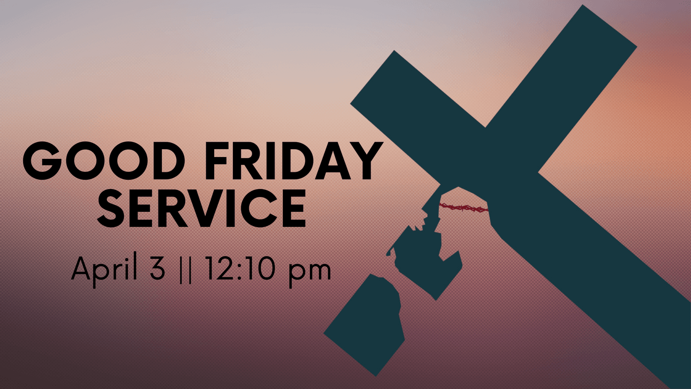 4/3 || 12:10pm - Good Friday Service. We pause to remember the sacrifice of Jesus and reflect on the meaning of the cross. This will be a solemn and reflective time with worship.