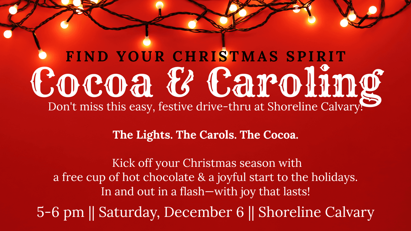 12/6 || 5-6 pm - Cocoa and Carols - Don't miss this easy, festive drive-thru at Shoreline Calvary! The Lights. The Carols. The Cocoa. Kick off your Christmas season with a free cup of hot chocolate & a joyful start to the holidays. In and out in a flash—with joy that lasts!
